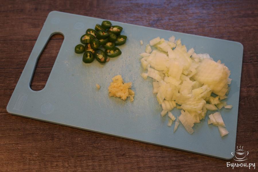 3. Лук нарежьте на маленькие кубики, перец чили нарежьте колечками, чеснок пропустите через пресс для чеснока.