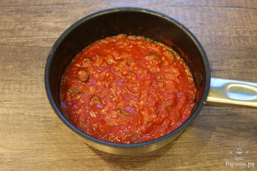 5. После добавьте протертые томаты в собственном соку, тушите все на небольшом огне 12-15 минут, добавьте томатную пасту, перемешайте.