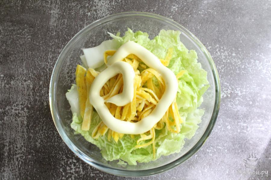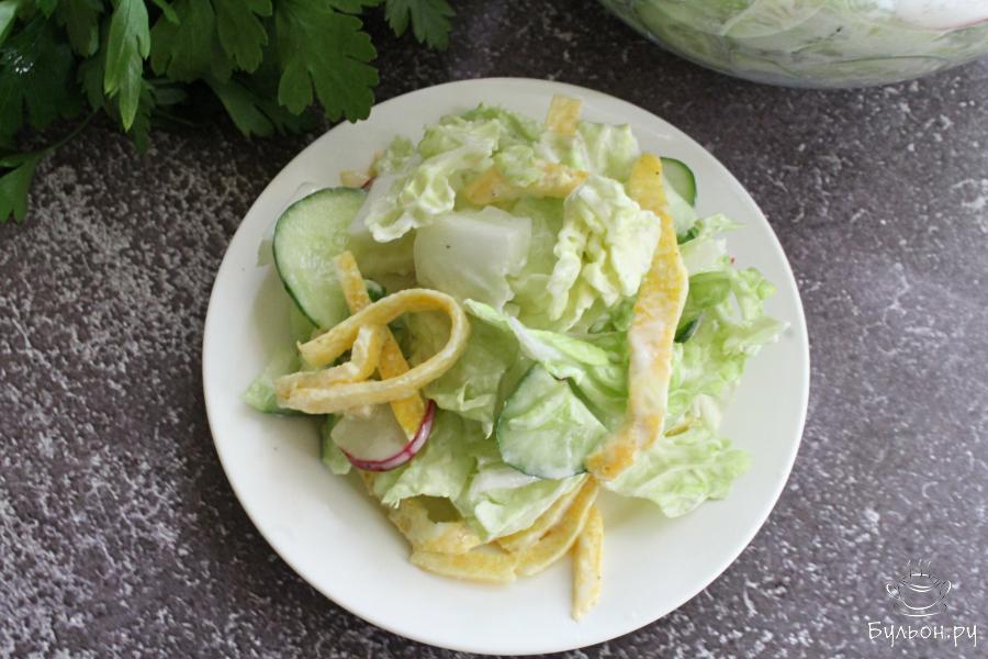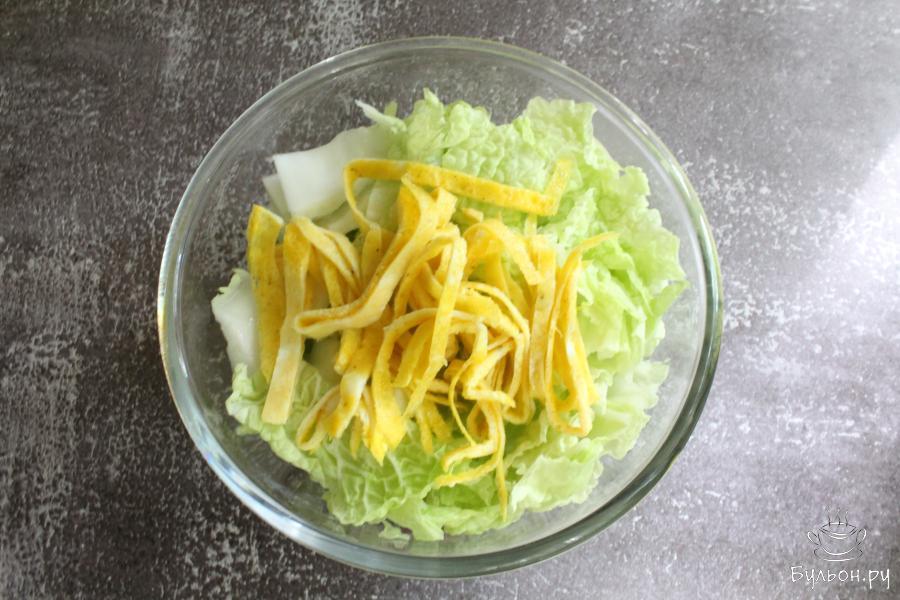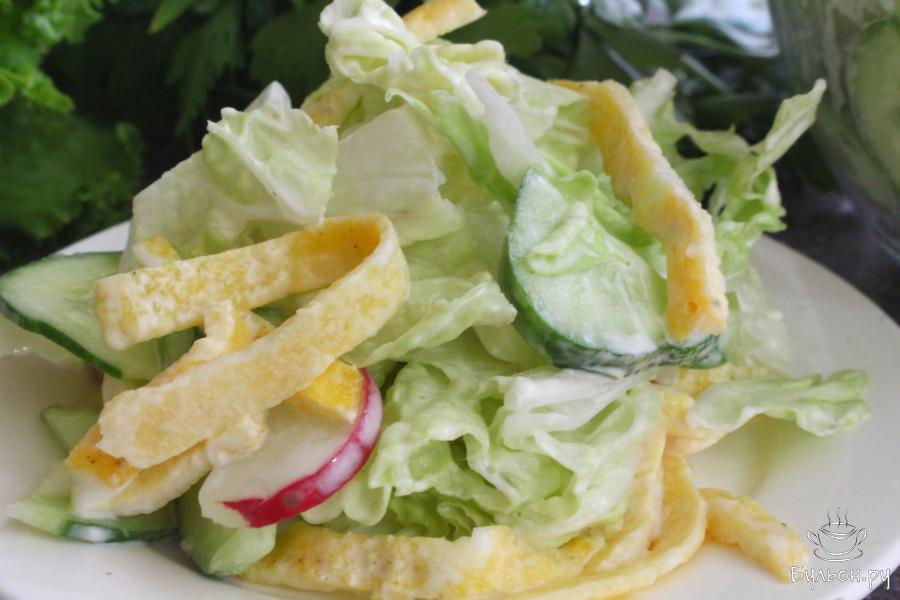 Салат из пекинской капусты с яичным блинчиком получается легкий, но и одновременно сытный. Он сочный, хрустящий, вкусный и насыщенный. Если вы не хотите употреблять майонез, то такой салат вполне можно заправить сметаной или душистым растительным маслом. Готовится салат очень быстро, на скорую руку. По желанию, яичных блинчиков можно сделать больше, тогда салат будет более каллорийный и сытный. Если вы любите салаты с зеленью, то добавляйте зелень.