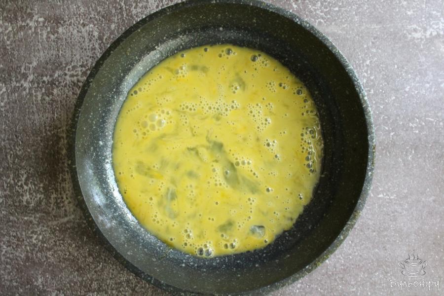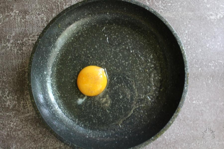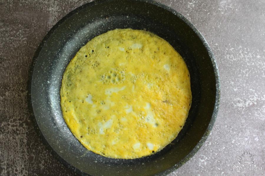 3. Пожарить яичный блинчик. Жарить его без крышки, с одной стороны, пару минут. Оставить блинчик остывать.