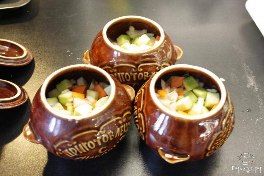 2. Смешать мясо с овощами, добавить оливковое масло, посолить, поперчить по вкусу. Разложить по горшочкам, влить в каждый по 1/4 стакана горячей воды. Закрыть крышкой или фольгой. Поставить в разогретую до 200 градусов духовку.
