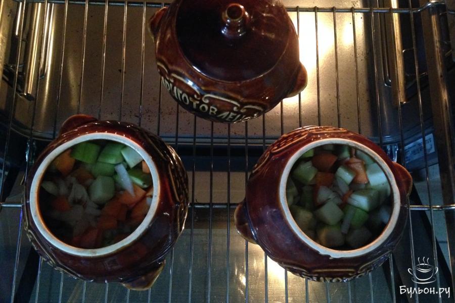3. Каждые 15-20 минут содержимое горшочков аккуратно перемешивать. Готовить 50 минут, или до мягкости мяса.