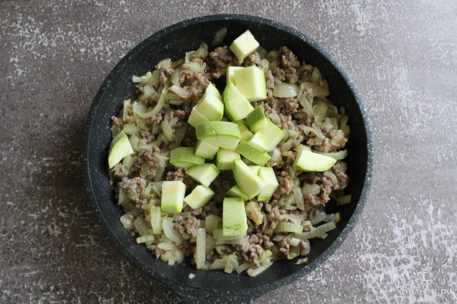 3. Кабачки промыть, нарезать кубиками, выложить на сковороду. Обжаривать все вместе 10 минут, помешивать.