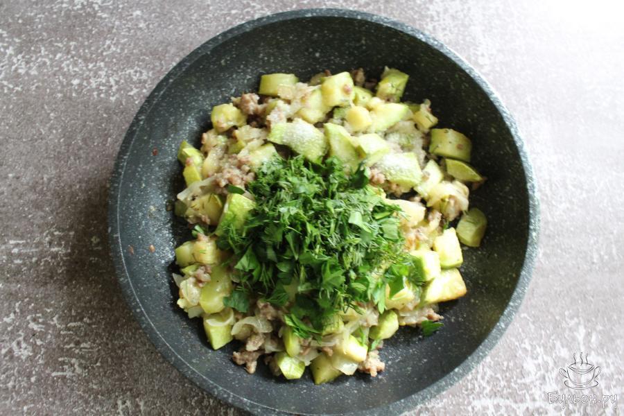 4. Зелень промыть, мелко нарезать, добавить на сковороду. Блюдо посолить, перемешать, тушить около пяти минут и убрать с огня.