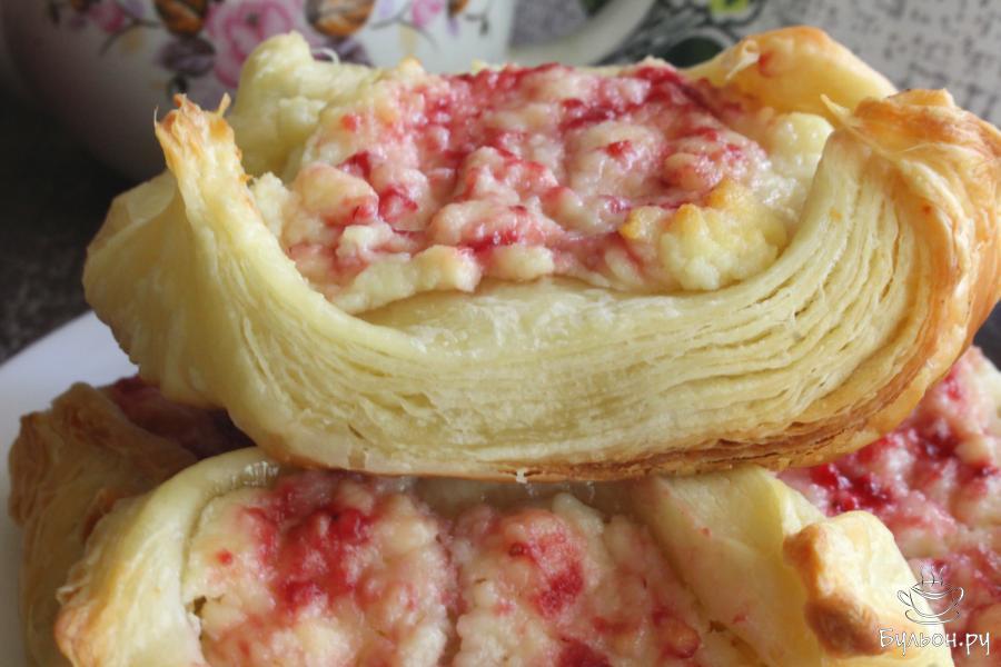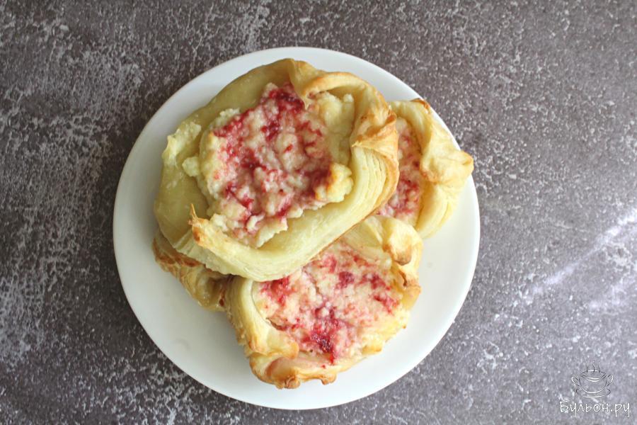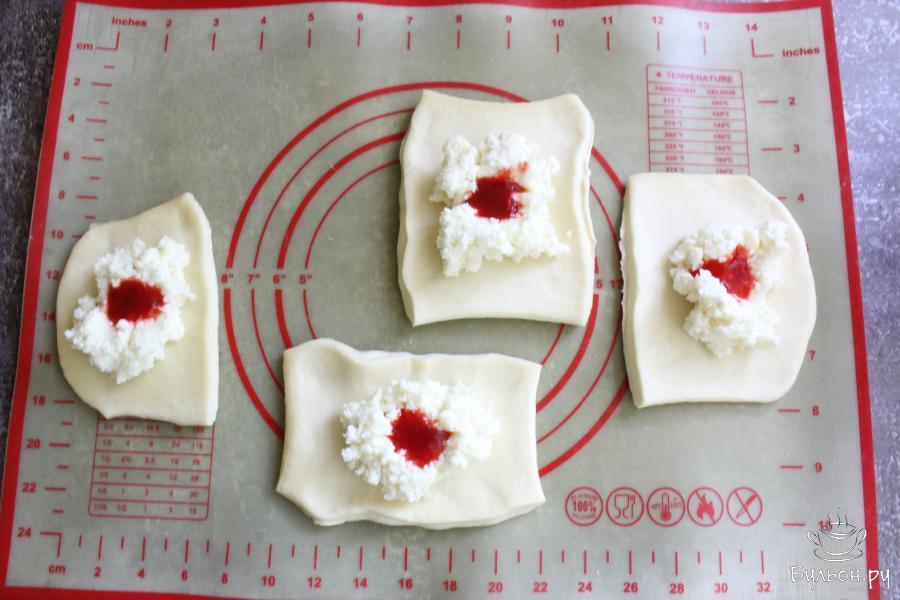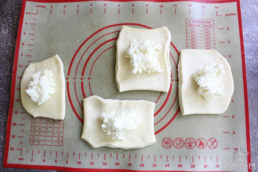 2. Слоеное тесто немного раскатать в одну сторону и разрезать на 4 квадрата. Разложить творог поровну на тесто.