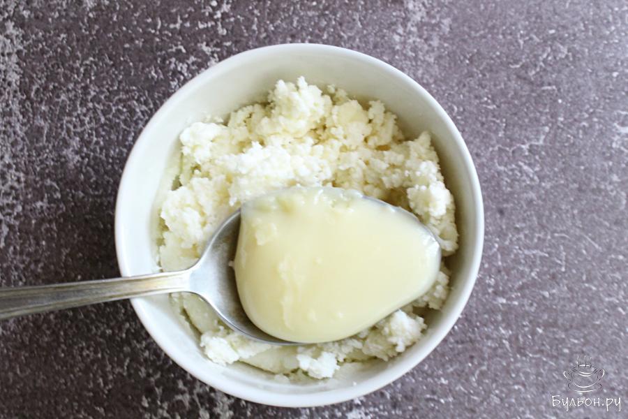 1. Творог растереть и смешать со сгущеным молоком, по вкусу. Если вы не любите комочки в твороге, то его надо измельчить в блендере или перетереть через сито.