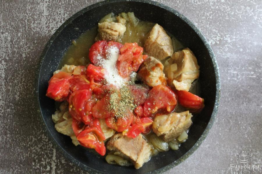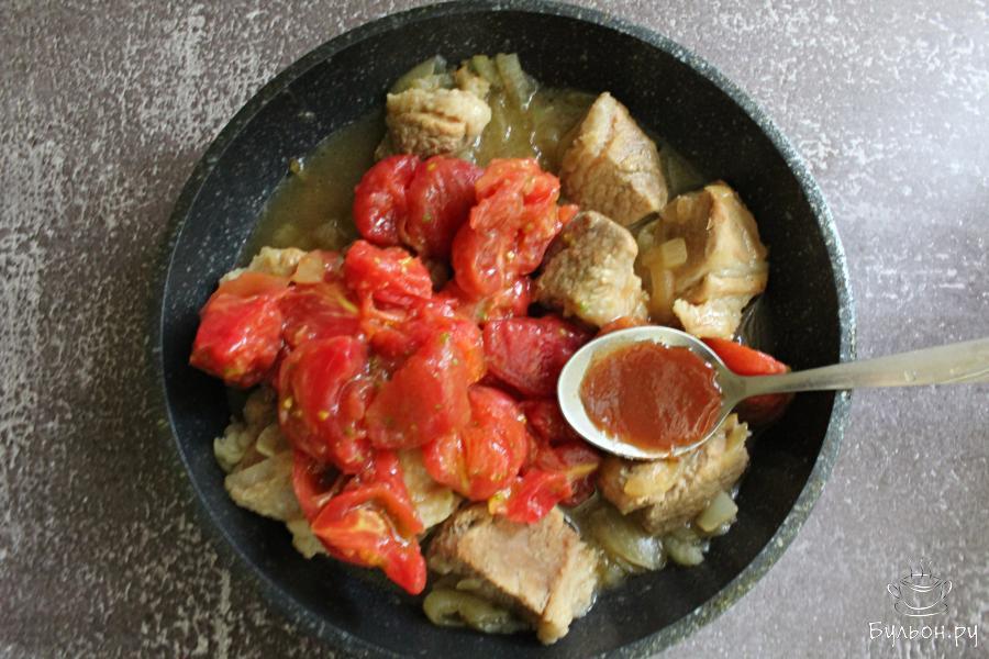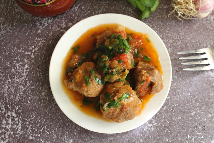 6. Добавить специи и пряности по вкусу, влить воду, чтобы она почти покрывала мясо. Накрыть посуду крышкой и тушить до мягкости мяса.