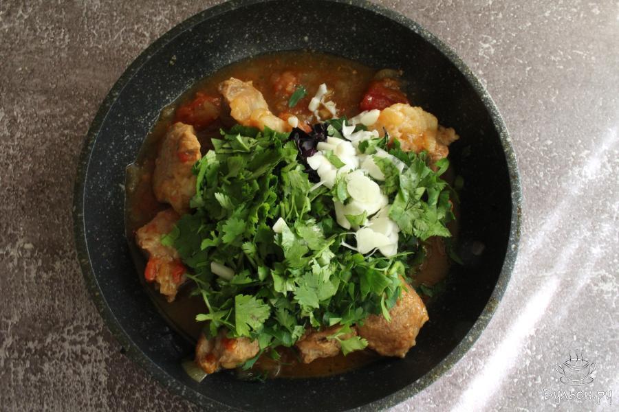 7. Чеснок и зелень (кинза, петрушка, базилик) нарезать мелко, добавить на сковороду. Перемешать, готовить еще 5 минут и убрать с огня.