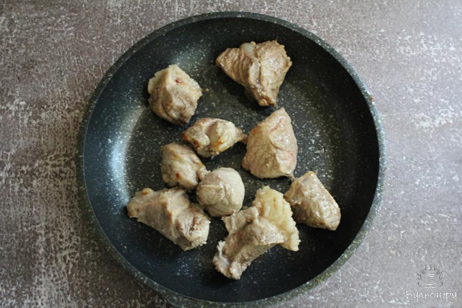 1. Мясо промыть, нарезать крупно и обжарить его, до легкой румяности, на сковороде с разогретым маслом.