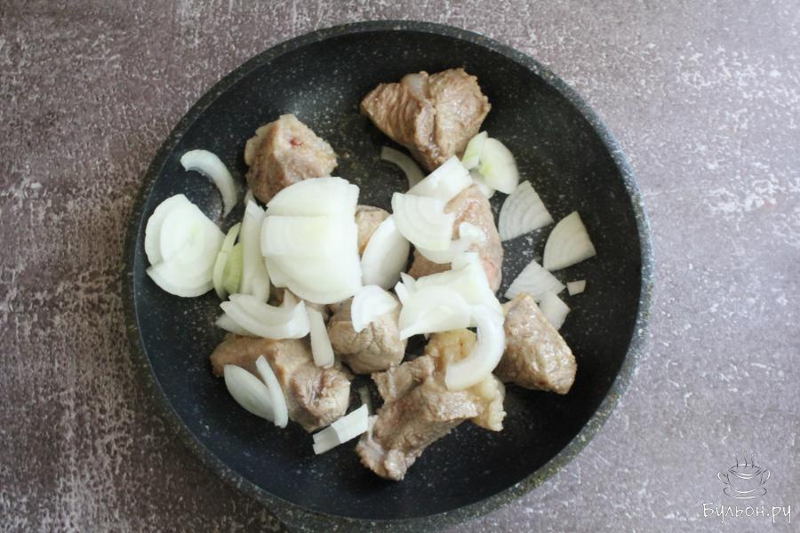2. Лук почистить, промыть, нарезать не очень мелко и добавить к мясу. Обжарить несколько минут, помешивать.