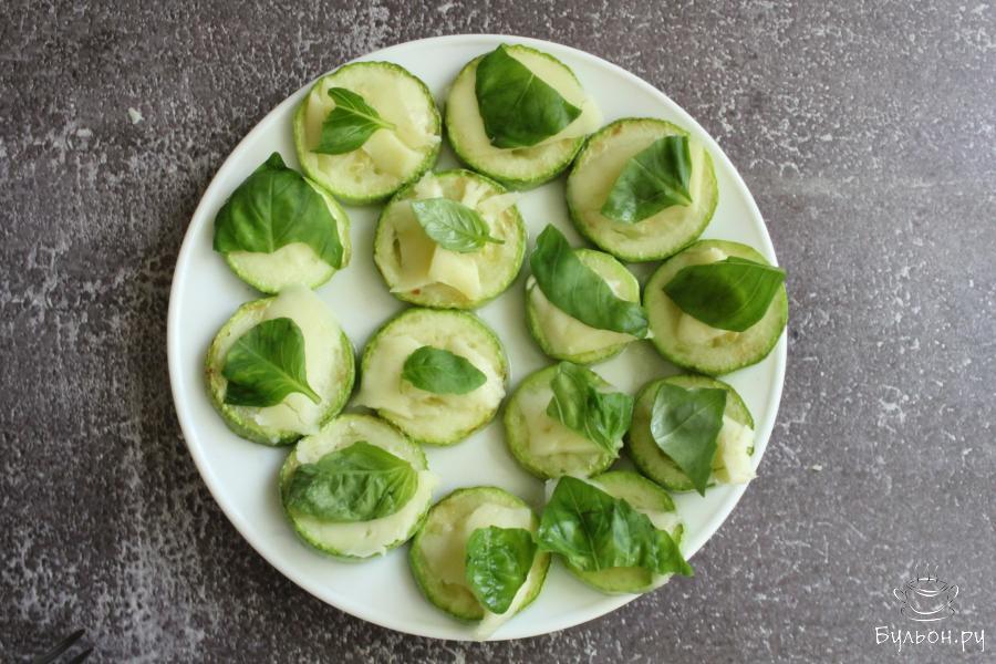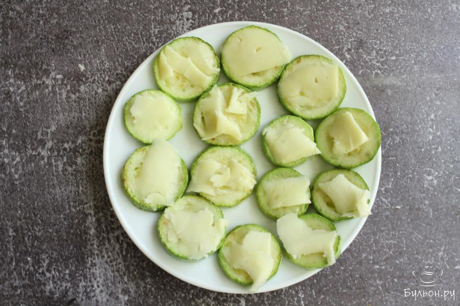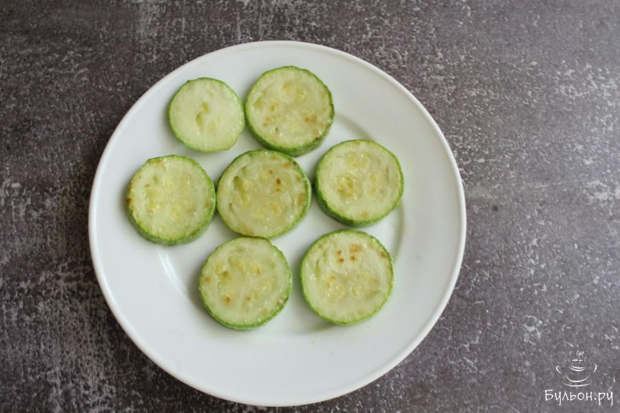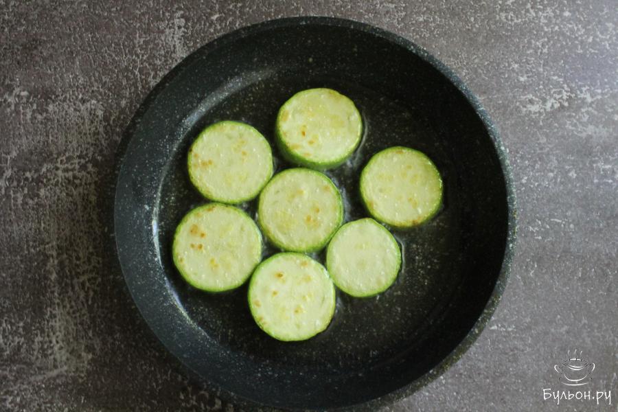 1. Кабачок промыть, обсушить и нарезать не очень тонкими кружочками. На сковороде разогреть масло и обжарить кабачки с двух сторон, до легкой румяности.