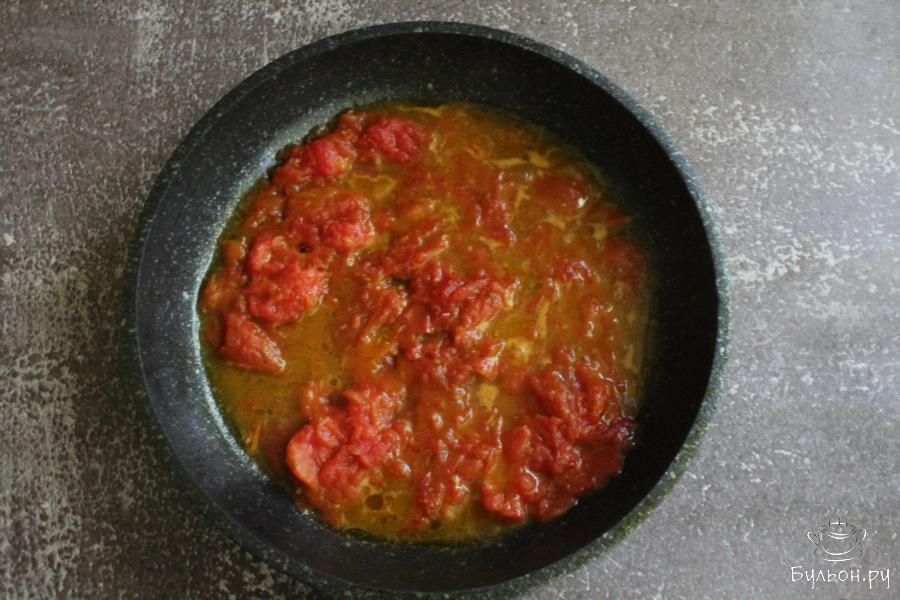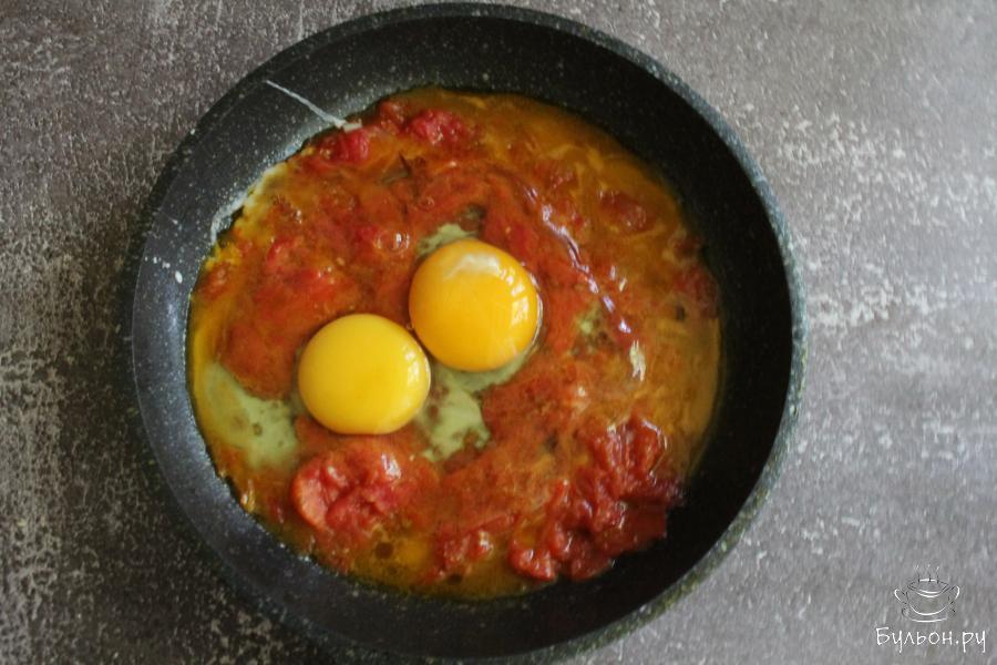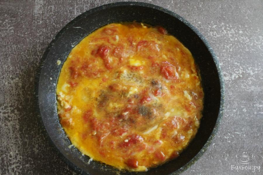 6. Посолить и поперчить яичницу, готовить ее пару минут. Помешивать аккуратно, чтобы оставалась крупные кусочки яичницы.