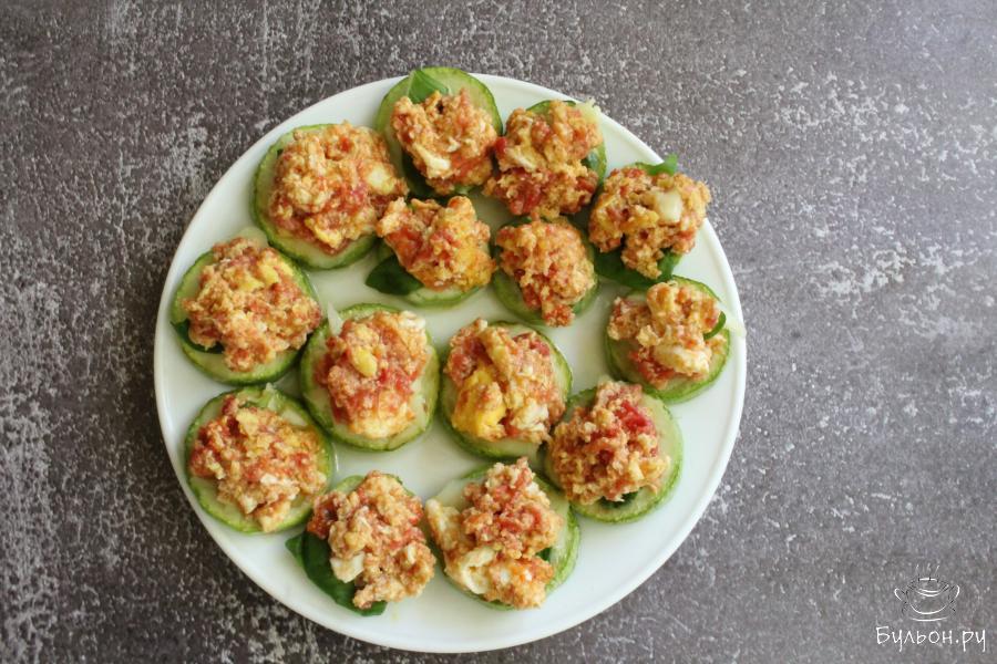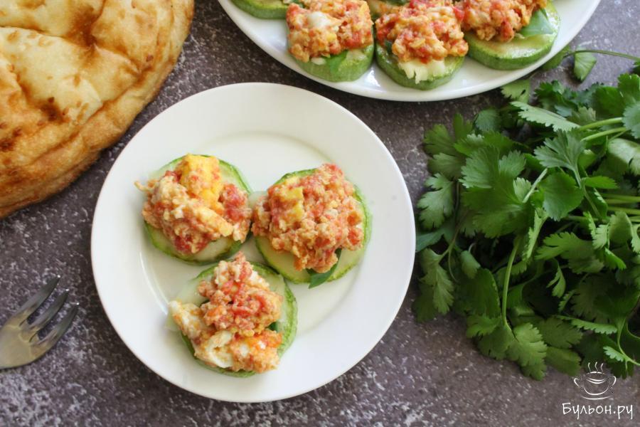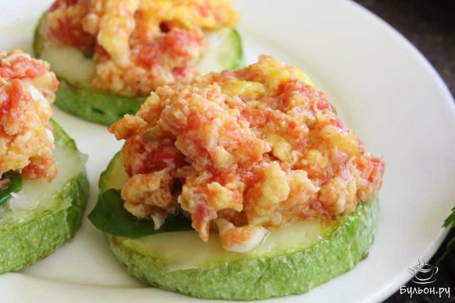 Закуска из кабачков с яйцом и овощами подойдет, как для обеда или ужина, так и для завтрака или перекуса в течение дня. Закуска получается очень сочная, ароматная, легкая и вкусная. Готовится это блюдо просто, быстро и из доступных продуктов. Такие простые закуски всегда можно приготовить по новому, добавить любимую измельченную зелень, использовать другие любимые пряности. В дополнение к сыру можно добавить мясные деликатесы, например: тонкий кусочек ветчины или колбасы. Будет вкусно в любом случае.