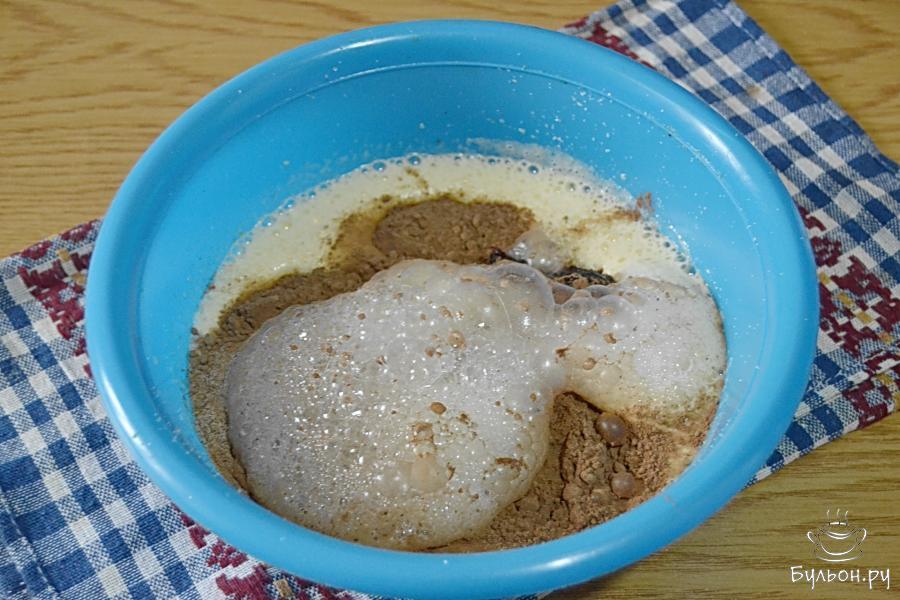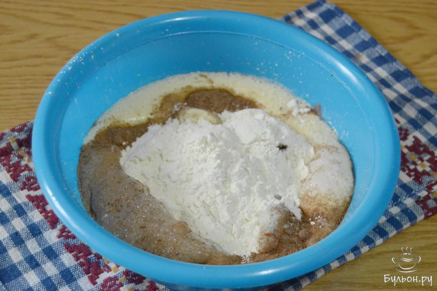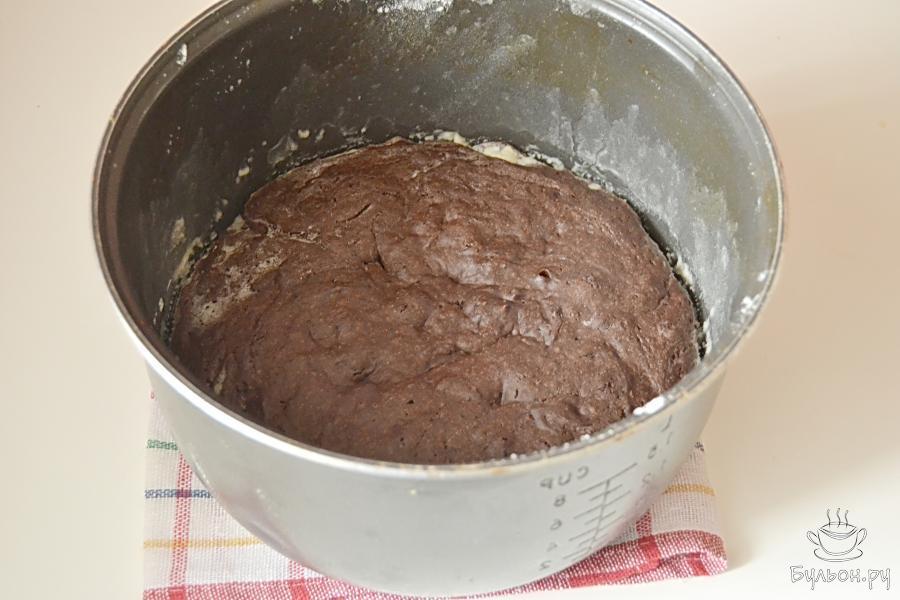 7. Ведерко мультиварки смазать подсолнечным маслом и припорошить мукой изнутри. Выложить тесто. Поставить чашу в мультиварку, установить программу "Выпечка" (температура от 118 до 122 градусов в зависимости от модели), время готовки - 50 минут.