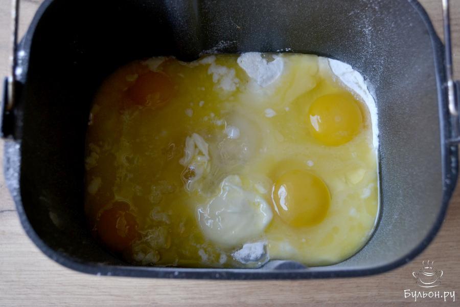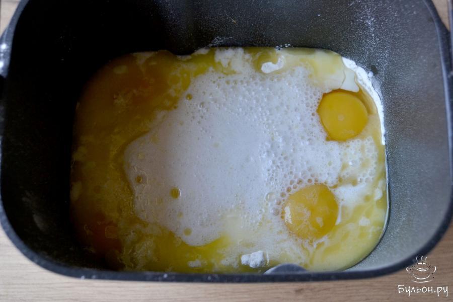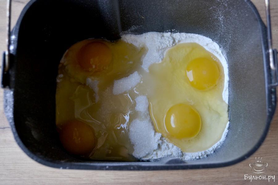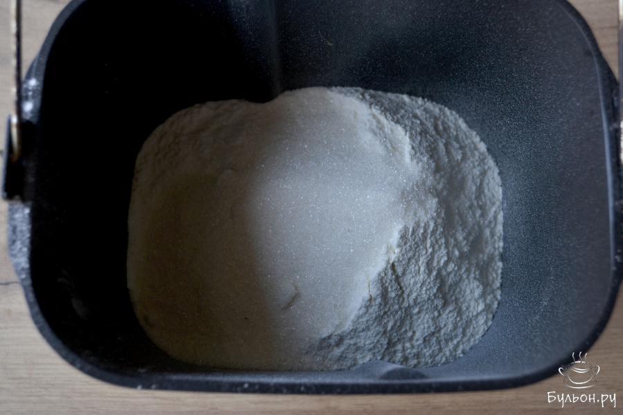 1. Первым делом залейте прессованные дрожжи теплой водой, чтобы они распустились, добавив к ним 1 ч. л. сахара В ведерко хлебопечки просейте муку высшего сорта, сахар и соль.