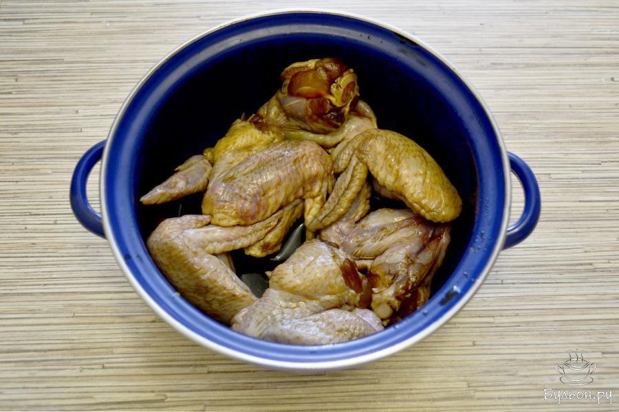 1. Куриные крылья вымойте, сложите в миску, полейте соевым соусом, перемешайте, чтобы крышки все покрылись соусом. Оставьте крылья мариноваться на 2-3 часа в холодильнике.