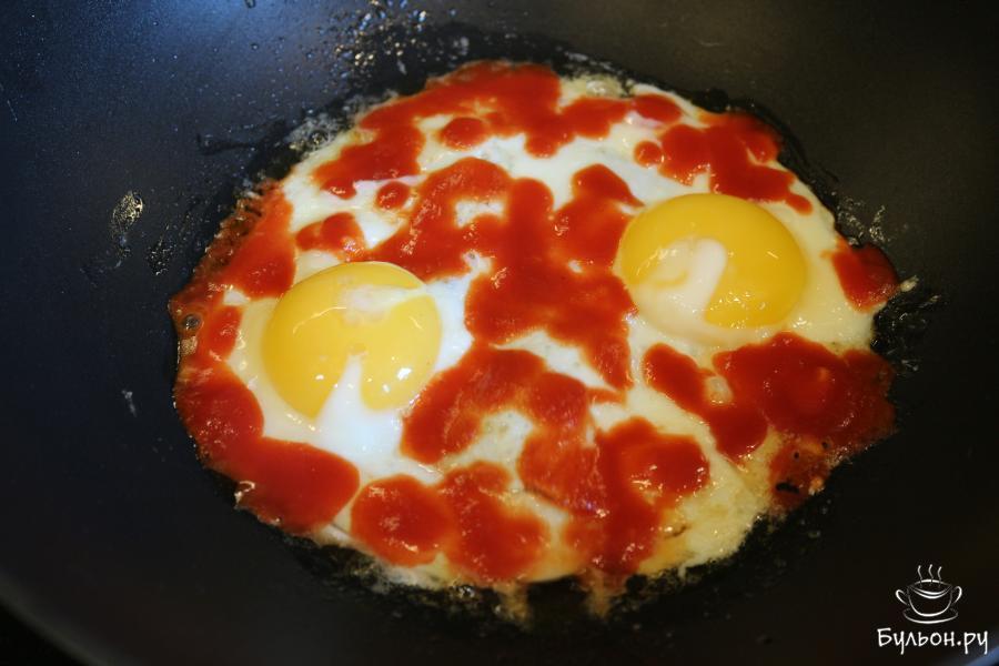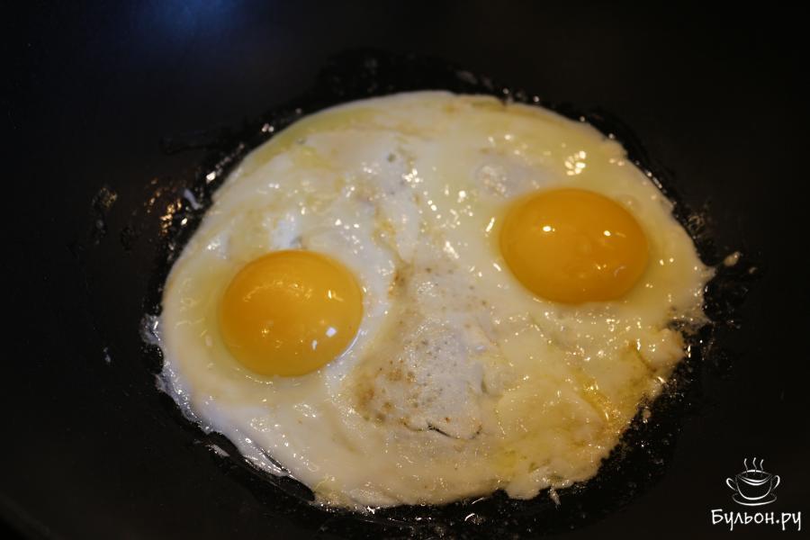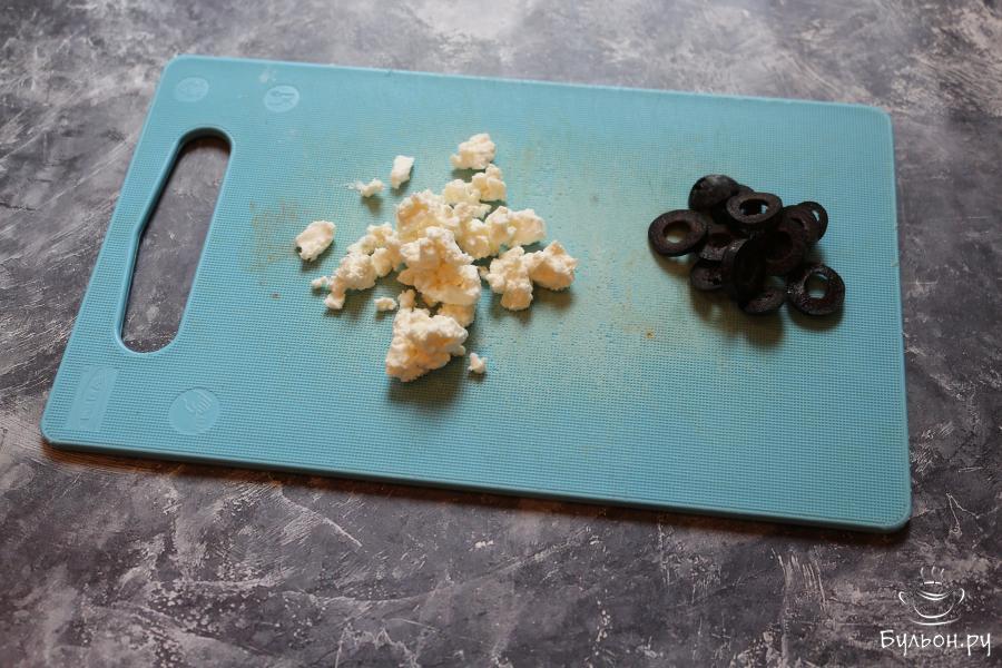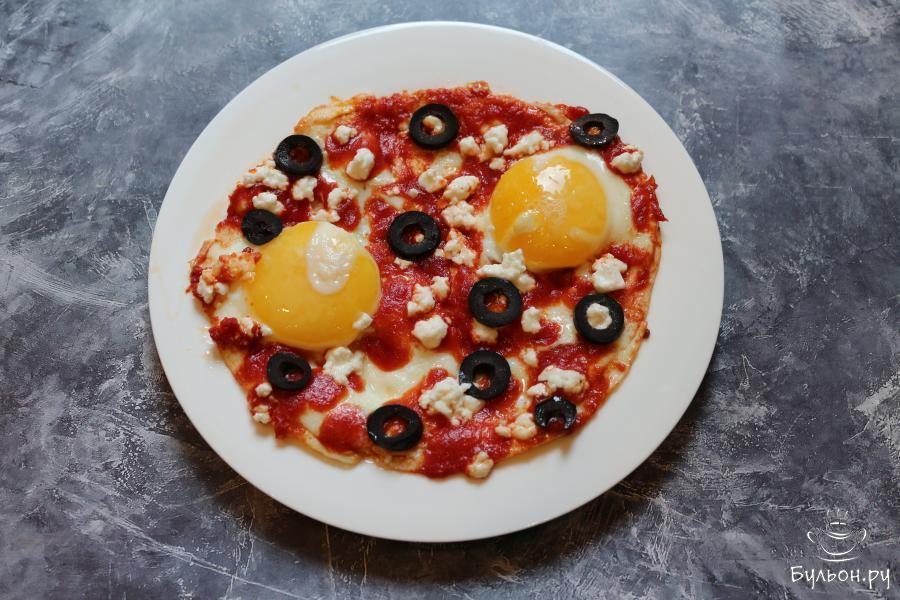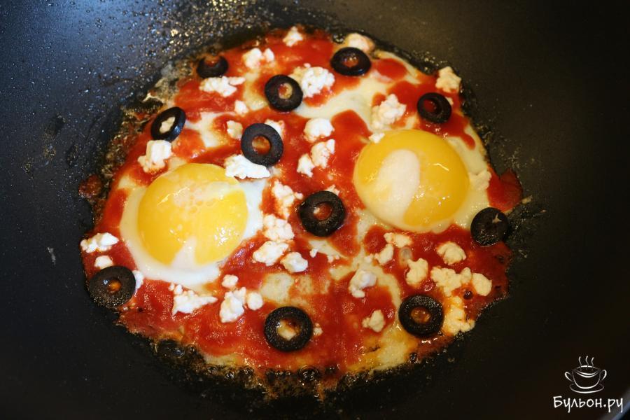 5. Яичницу посыпьте крошкой из феты и кружочками маслин. Готовьте блюдо еще 3 минуты, до готовности.