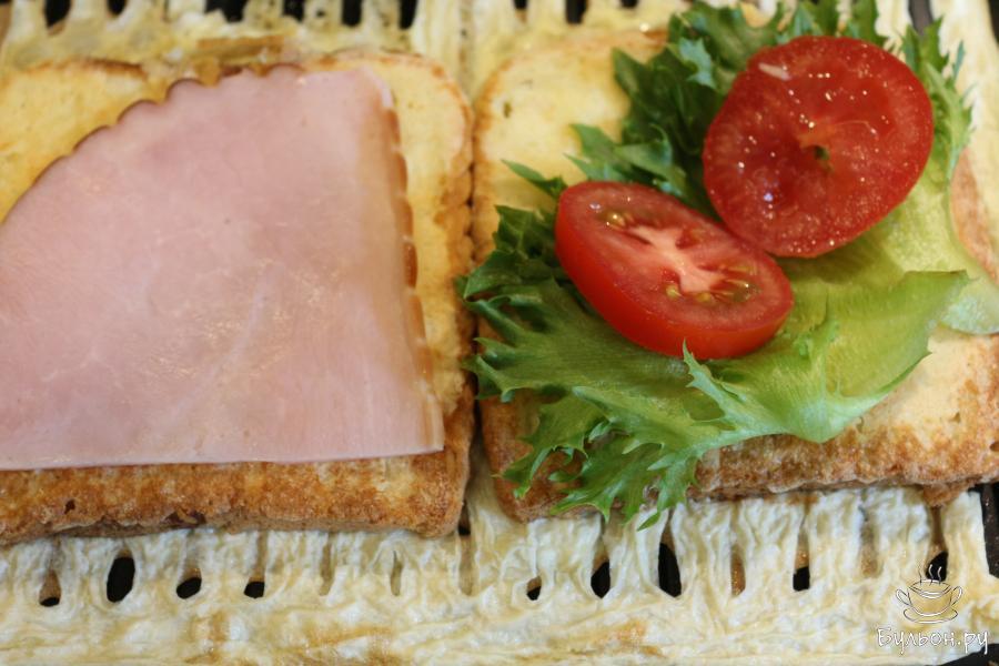 4. Откройте гриль, переверните всю конструкцию сыром вниз. Выложите на одну половину ветчину, на другую фриллис и помидоры.