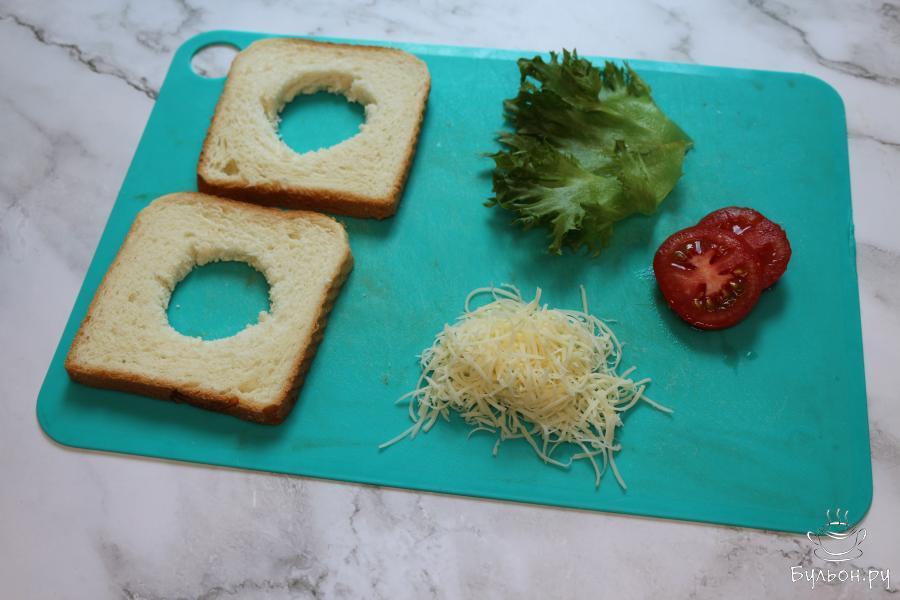 1. Заранее подготовьте ингредиенты. У помидора отрежьте 2 кружка, промойте и высушите листочек фриллиса. Из белого хлеба вырежьте в центре кружки с помощью обычного стакана. Натрите кусочек сыра.