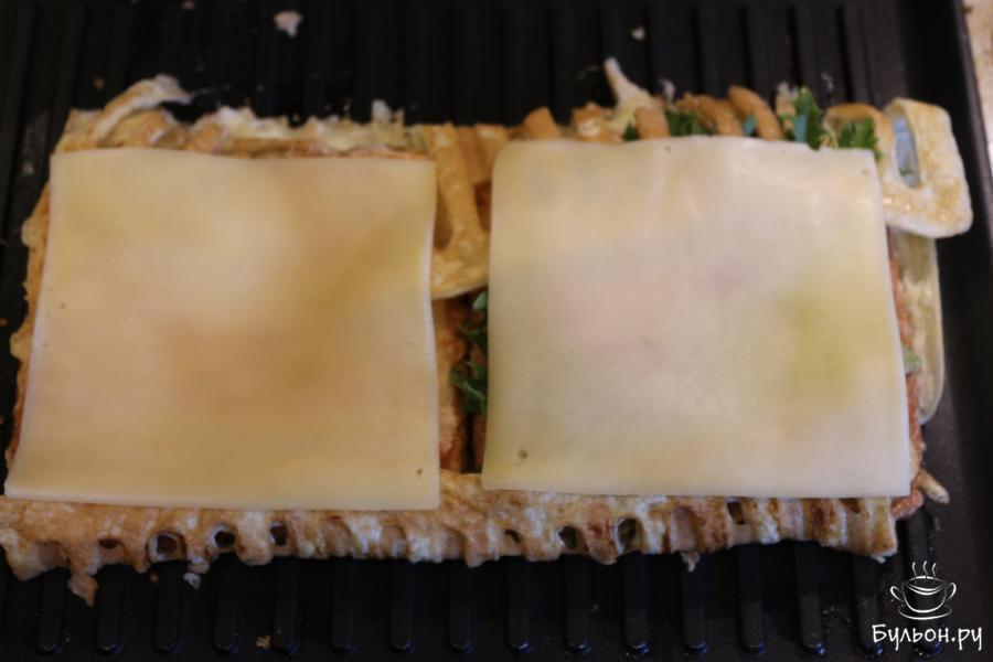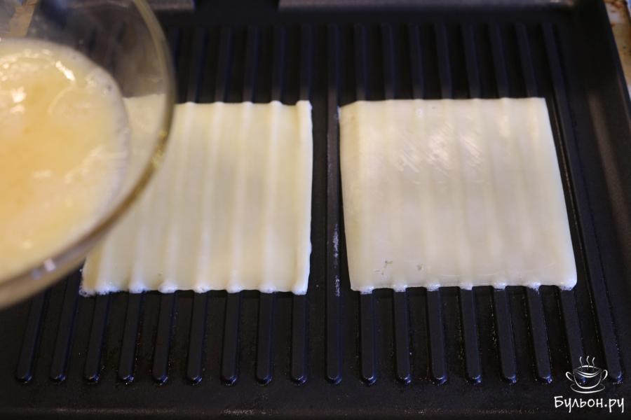 2. Хорошо разогрейте гриль. В миске взбейте до однородности яйца с щепоткой соли. Два кусочка сыра пластами выложите на поверхность гриля. Сразу же залейте их яичной массой.