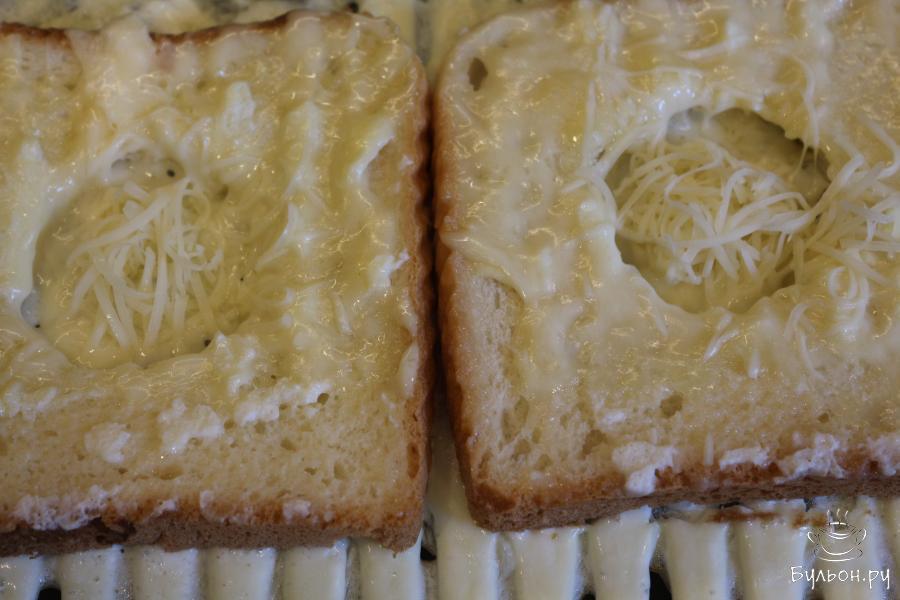 3. Сверху на расстоянии друг от друга положите кусочки белого хлеба. Обжарьте их 1 минуту, или пока не схватится омлет, переверните все вместе. В центр каждого углубления хлеба положите натертый сыр, накройте гриль, жарьте минуту чтобы сыр расплавился.