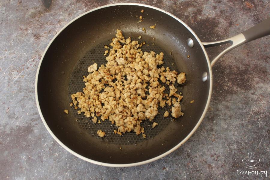 1. Нарежьте кубиками лук и слегка обжарьте его на растительном масле, затем добавьте фарш и продолжайте жарить.