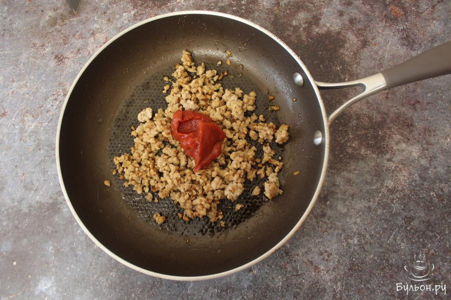 2. В конце приготовления добавьте соль и томатную пасту. Обжарьте еще в течение 1-2 минут, постоянно помешивая.