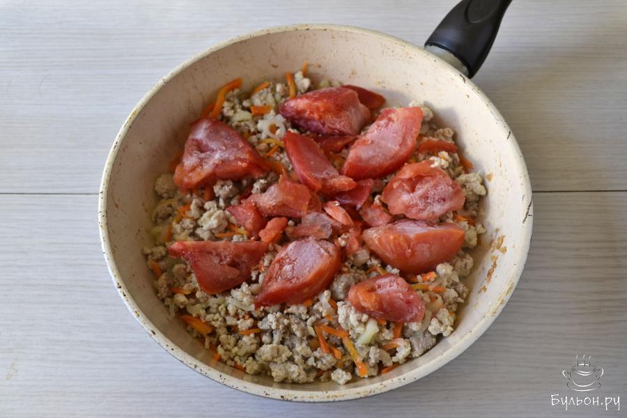 3. Положите в сковороду нарезанные помидоры. Можно использовать как свежие, так и замороженные томаты.