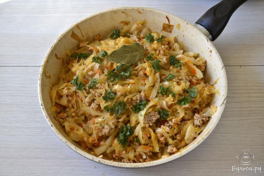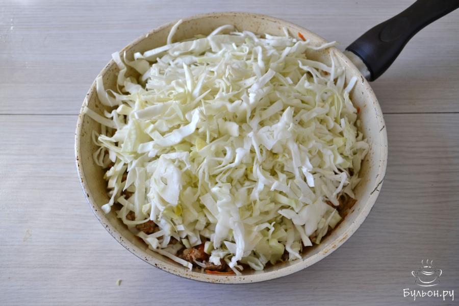 5. Положите в сковороду капусту, нарезанную тонкой соломкой, посолите. Перемешайте, тушите до желаемой мягкости капусты. Кто-то любит, чтобы капуста была очень зажаренная, мне больше нравится, чтобы капуста была слегка хрустящая.