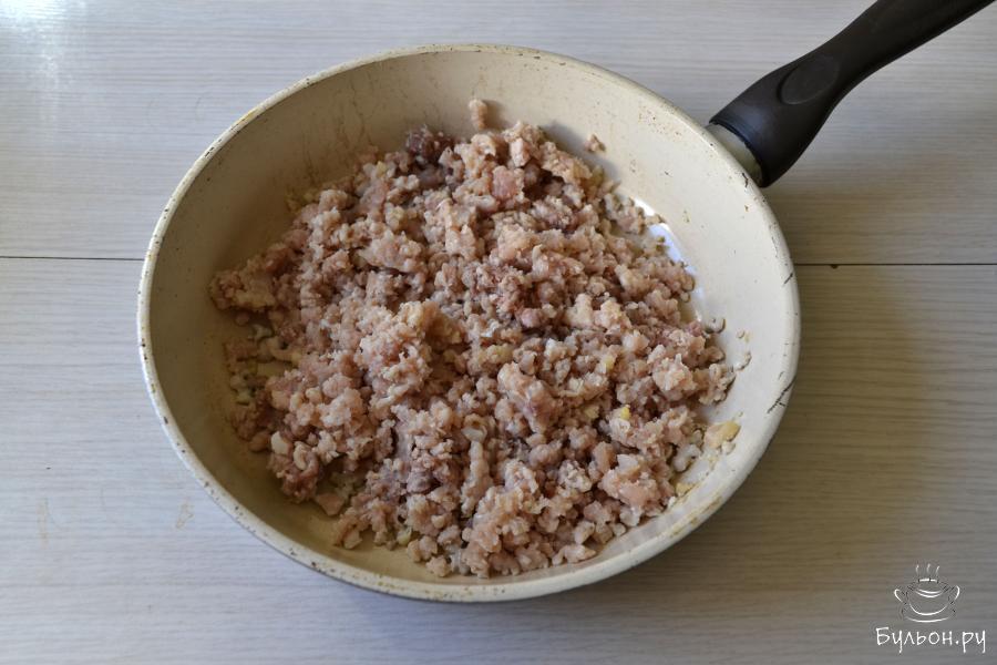 1. Положите мясной фарш на разогретую с растительным маслом сковороду. Сразу же лопаткой разбейте фарш, чтобы он не получился одним комком. Обжаривайте фарш 5-6 минут.