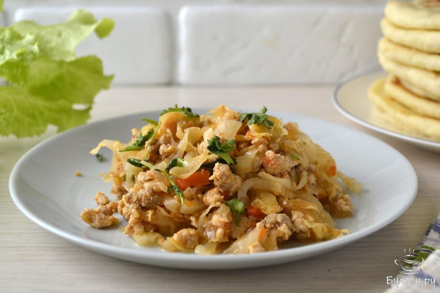 Тушеная капуста с овощами - блюдо вкусное, легкое, полезное. А если приготовить капусту с мясным фаршем, блюдо получится еще более вкусным и сытным. Фарш можно взять любой: куриный, говяжий, свиной или смесь разных видов фарша. Приправить блюдо можно любимыми специями и приправами. Время приготовления капусты будет зависеть от сорта капусты и от того, какую капусту вы предпочитаете - мягкую или чуть хрустящую.