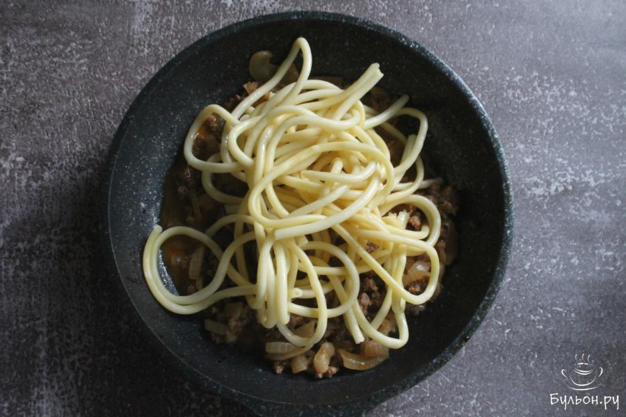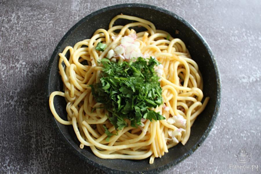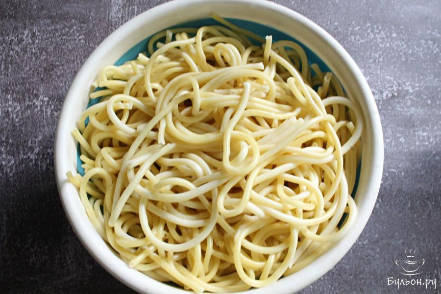 1. Спагетти сварить до готовности, руководствуясь инструкцией на упаковке. Откинуть спагетти на дуршлаг.