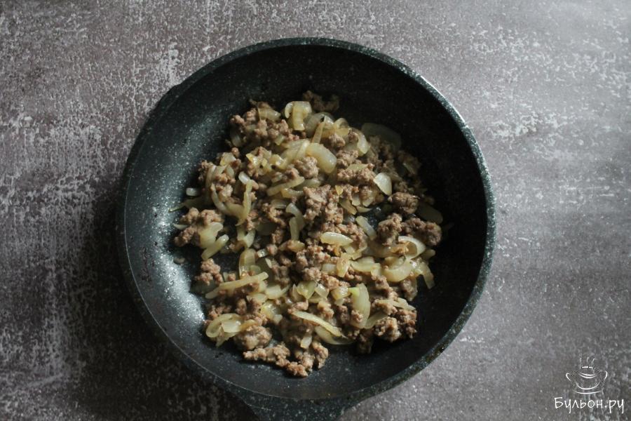 2. Лук почистить, промыть, мелко нарезать и обжарить его на сковороде с разогретым маслом до мягкости.