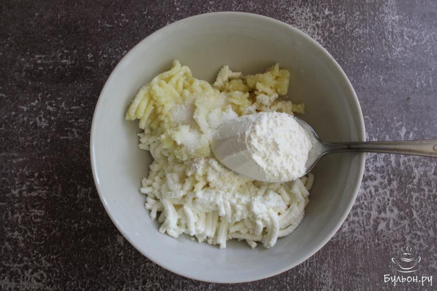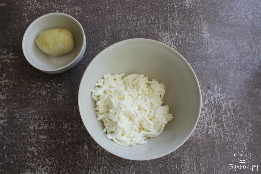 1. Небольшую картофелину сварить в мундире, остудить и почистить. Творог перекрутить через мясорубку.