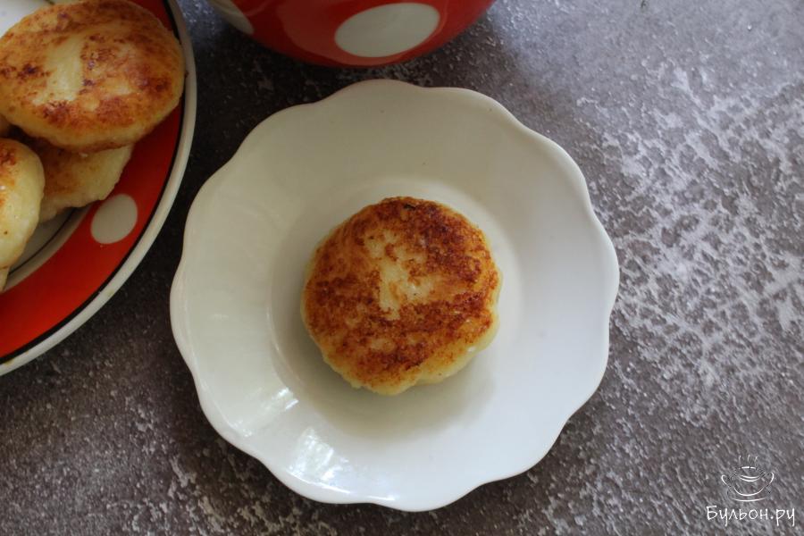4. На сковороде разогреть масло. Руки смочить в воде, сформировать творожники. Жарить творожники на небольшом огне, с двух сторон, до румяного цвета.