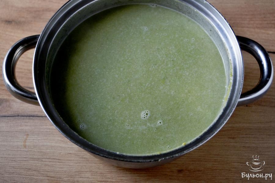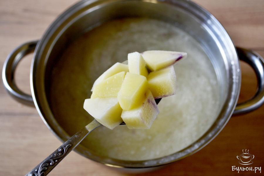 4. Когда картофель будет полуготовый, положите в кастрюлю зеленый горошек. Варите суп с горошком еще 6-7 минут.