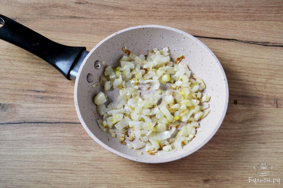 3. Репчатый лук почистите, нарежьте мелким кубиком и слегка обжарьте, до золотистого цвета, на растительном масле, положите его в кастрюлю следом за картофелем.