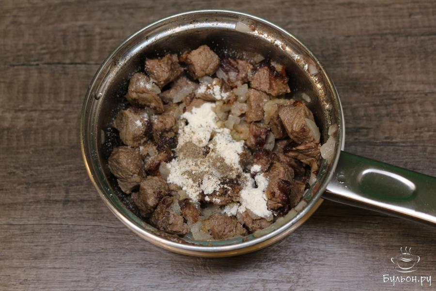 3. Добавьте пшеничную муку, черный молотый перец и соль. Все хорошо перемешайте, обжарьте еще 3 минутки.