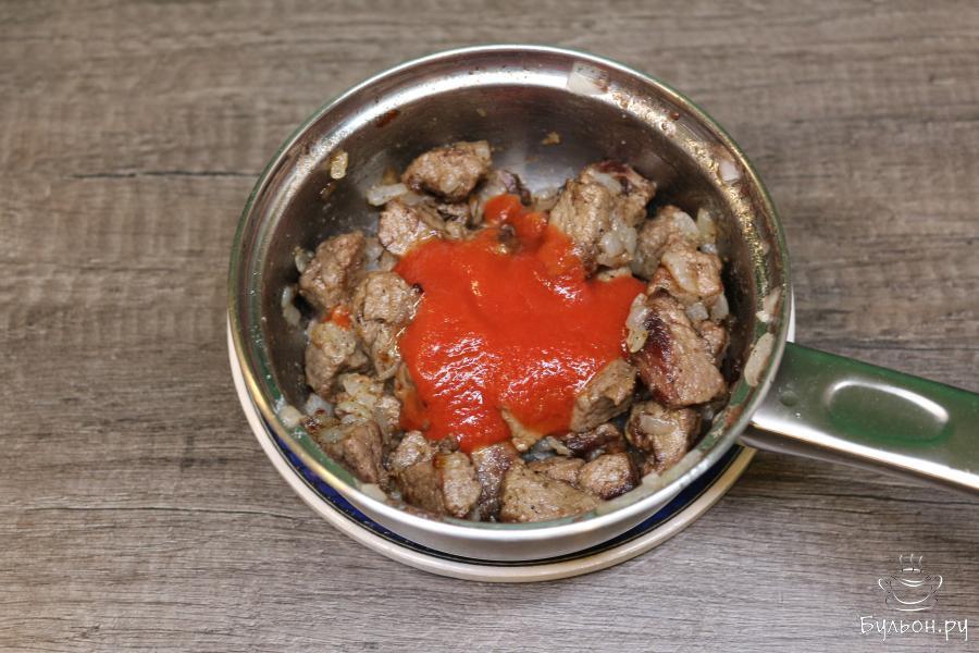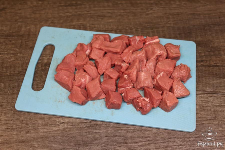 1. Говядину нарежьте на кубики, выложите в сотейник, добавьте растительное масло. Обжаривайте, постоянно помешивая, до начала образования корочки на мясе.