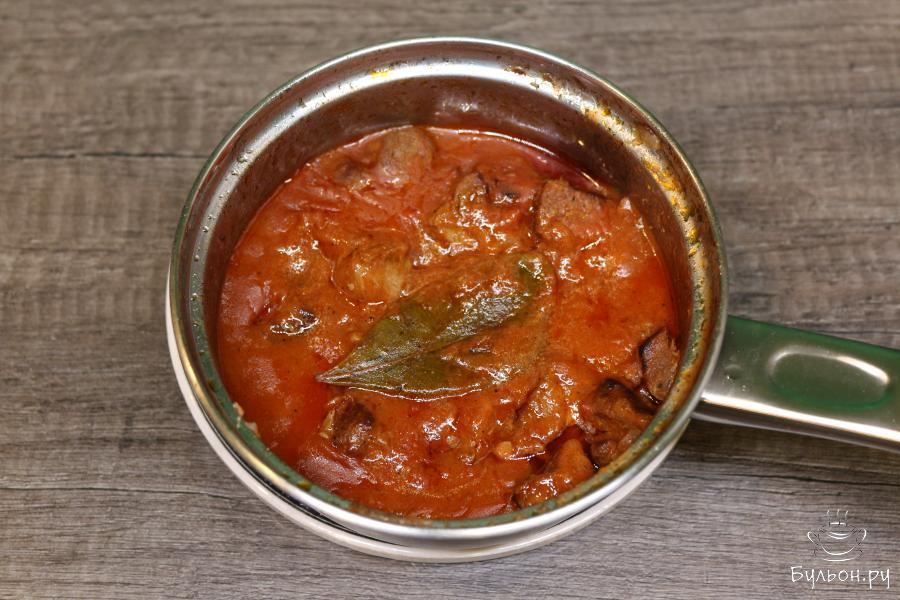 5. Через 3 минуты влейте воду и положите лавровый лист. Закройте сотейник крышкой и тушите гуляш еще 1,5 часа. Количество воды регулируйте самостоятельно, ее объем зависит от размера сотейника. Но учтите, она должна полностью покрывать кусочки мяса.