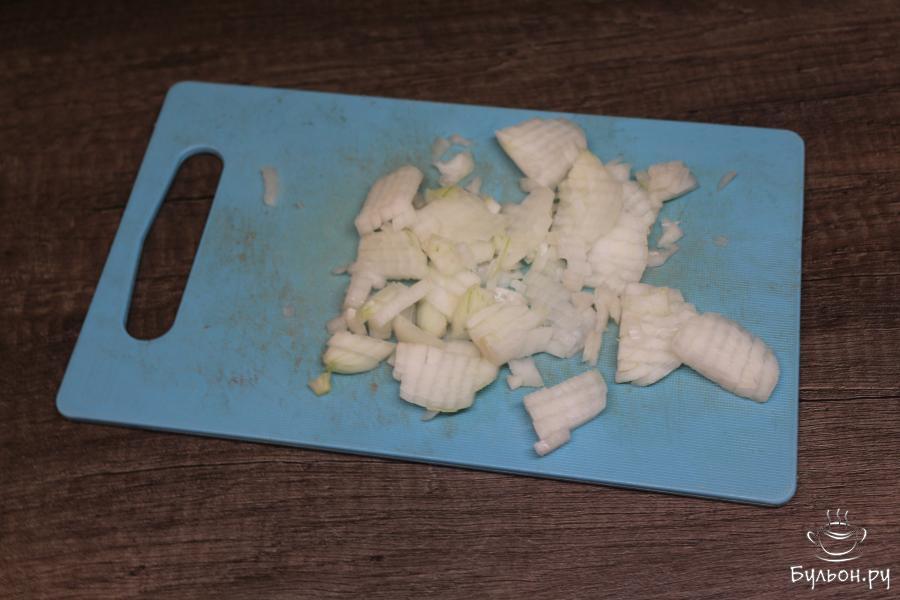 2. В это время нарежьте на мелкие кубики репчатый лук, добавьте его к мясу, перемешайте и жарьте, помешивая, еще в течение 5 минут.