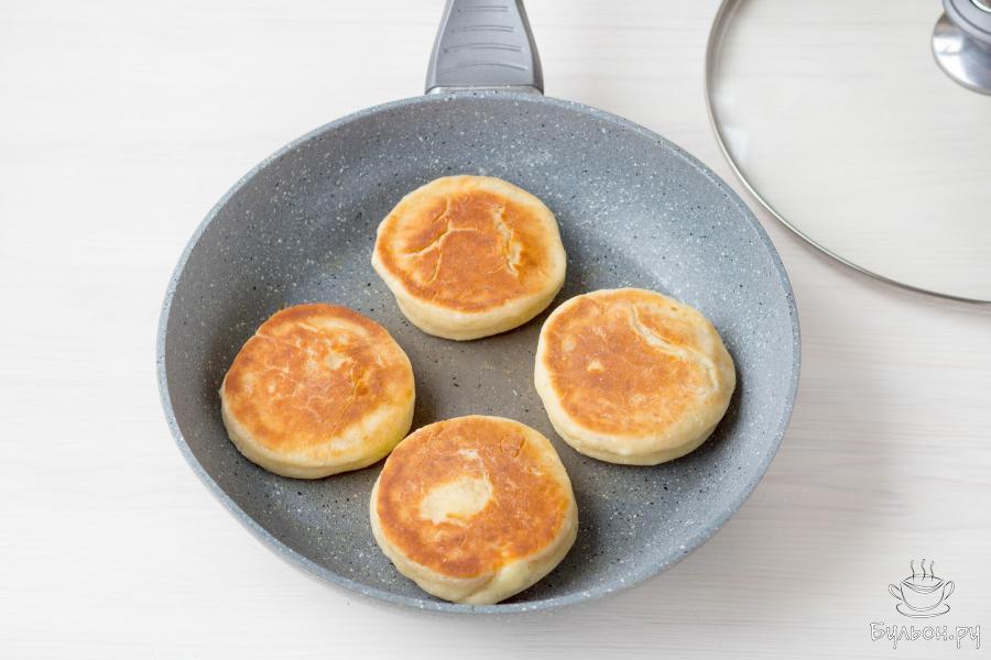 14. Затем переверните и обжарьте сырники еще 3-5 минут, с другой стороны. На этом этапе приготовления сковороду можно прикрыть крышкой.