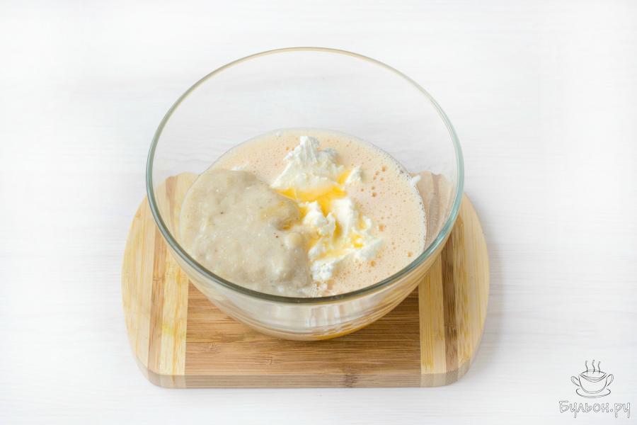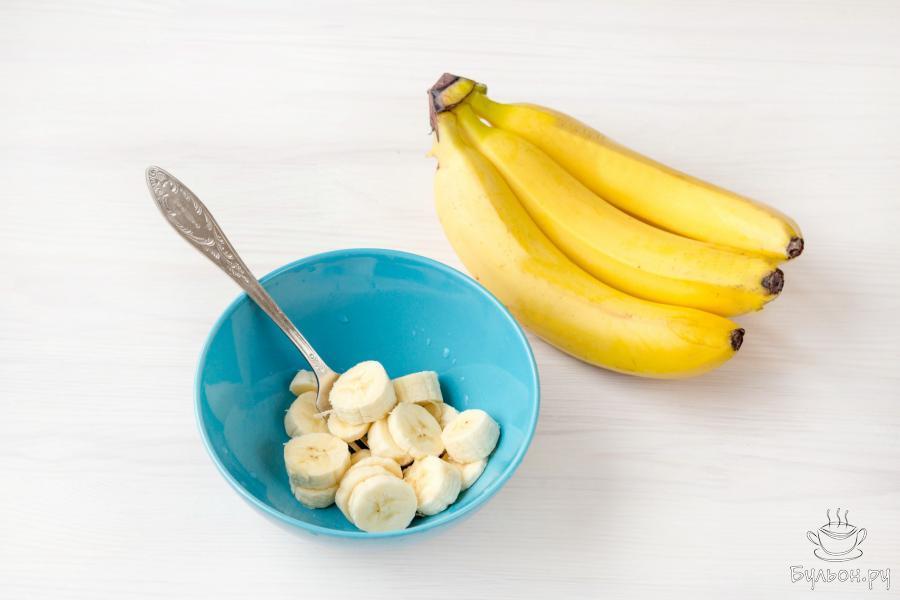 3. Один спелый банан разомните вилкой или измельчите в блендере до состояния пюре. Второй банан, не очищая от кожуры, нарежьте кружочками толщиной 3-4 миллиметра.