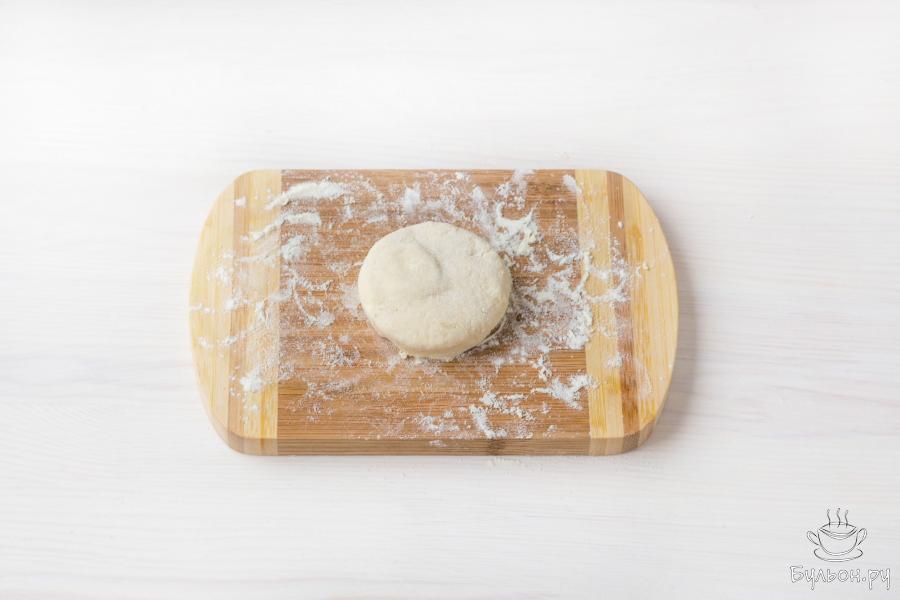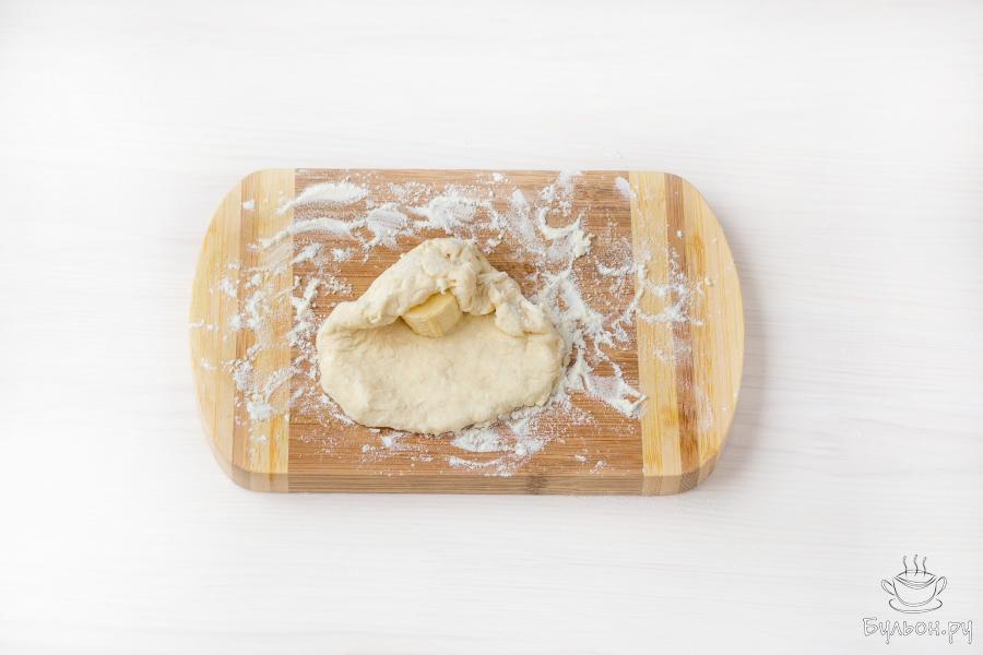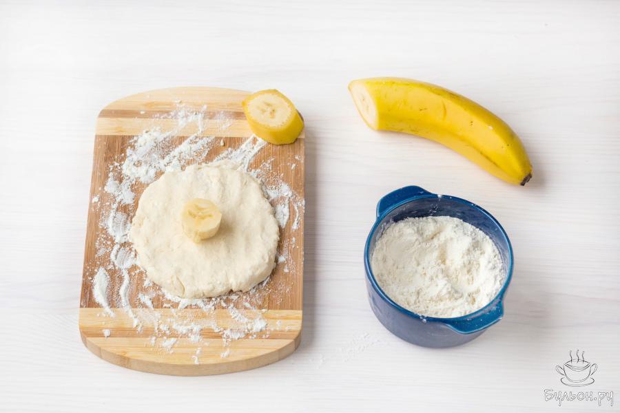 9. Обваляйте порцию теста в муке, обомните и сформируете плоскую лепешку толщиной около 1 сантиметра. Очистите кусочек банана от кожуры и выложите в центр лепешки.