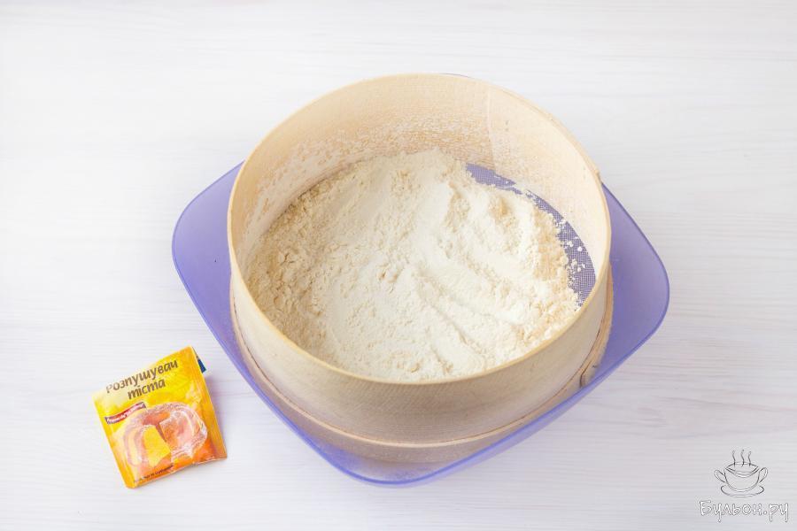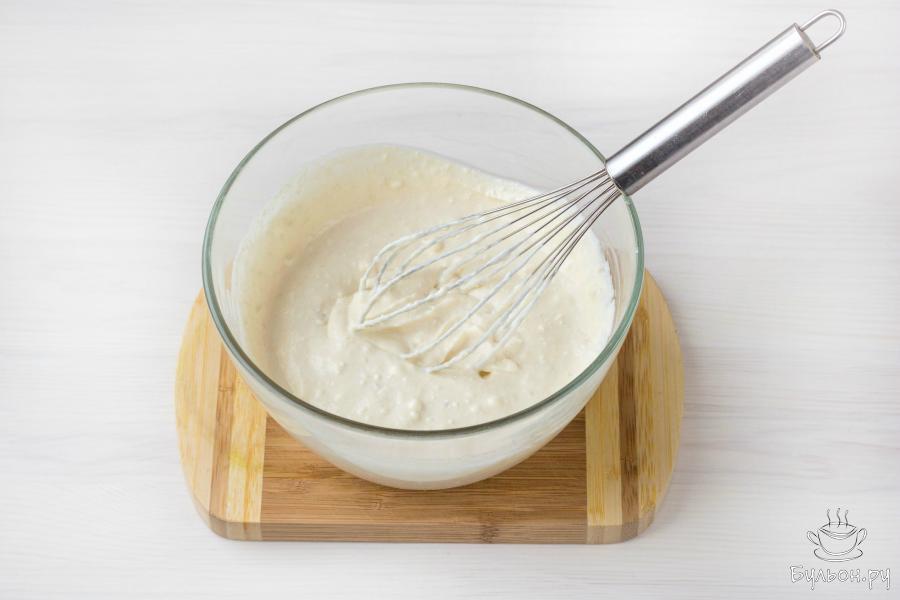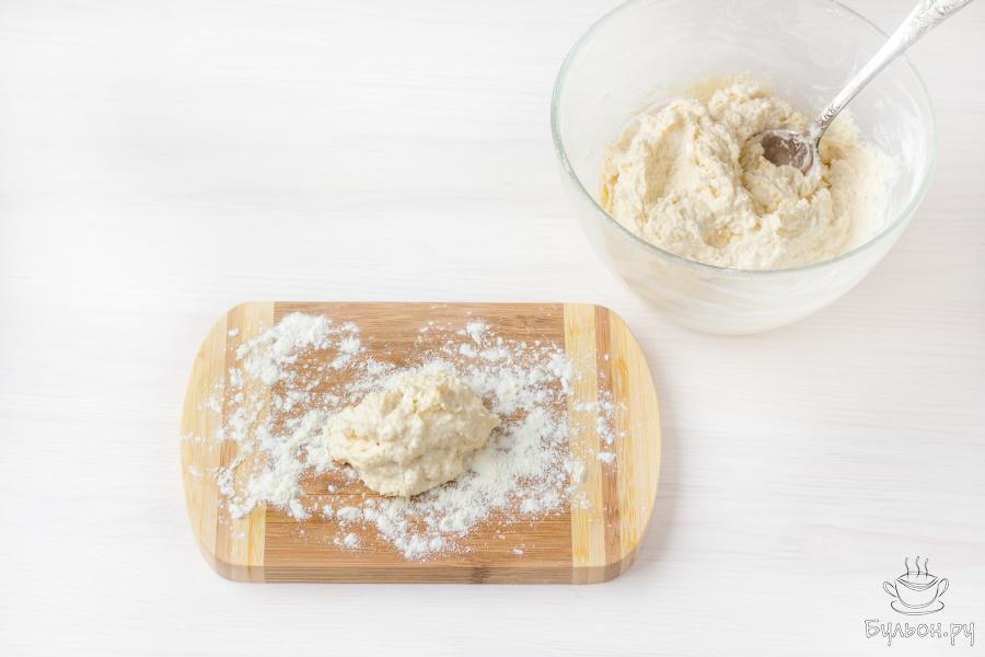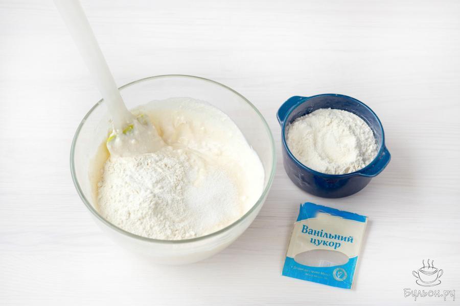 7. Добавьте к творожной массе ванильные сахар, а затем, постепенно небольшими порциями добавьте муку с разрыхлителем. У вас получится густое и довольное липкое тесто.