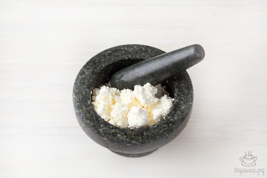 1. Протрите творог через сито, измельчите в блендере или разотрите при помощи ступки или толкушки для картофеля до пастообразного состояния.