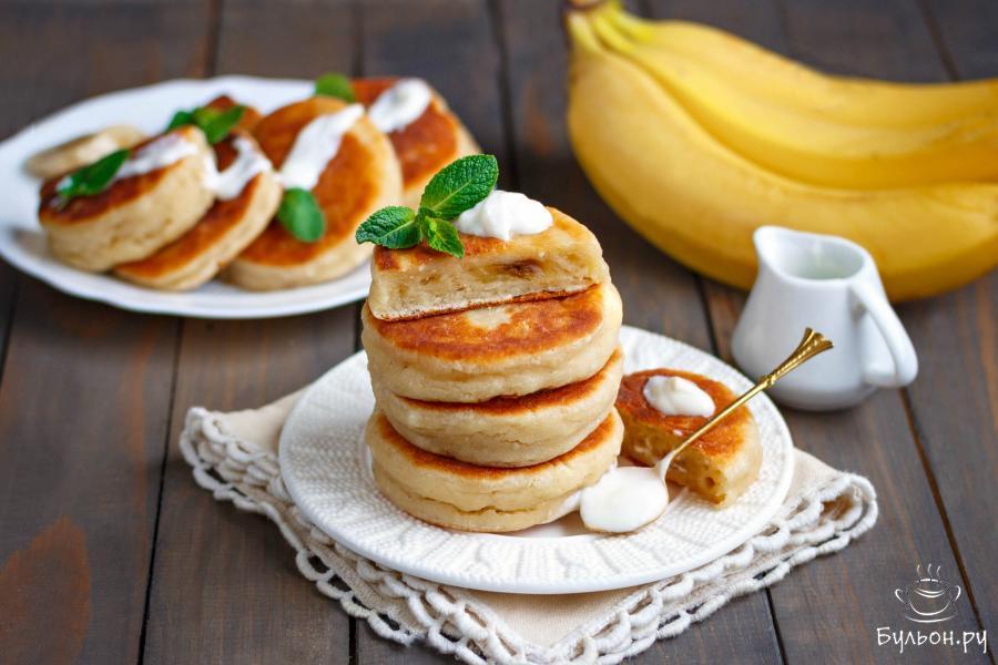 15. Готовые нежные сырники с бананом подавайте к столу горячими, дополнив по желанию йогуртом, сметаной или медом.