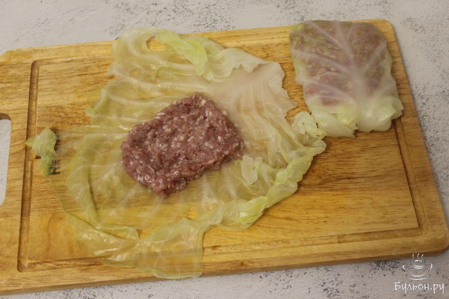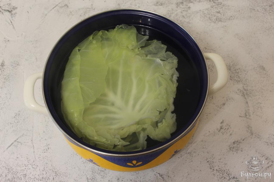 1. 8 штук капустных листов отварите в большом количестве воды, до мягкости. Затем срежьте у каждого листа уплотнение.