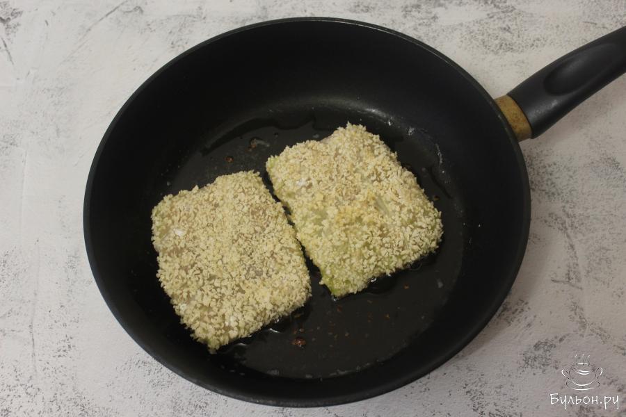 5. В хорошо разогретой сковороде, на среднем огне, на растительном масле, обжарьте подготовленные капустные конверты, с двух сторон, до золотистой корочки.