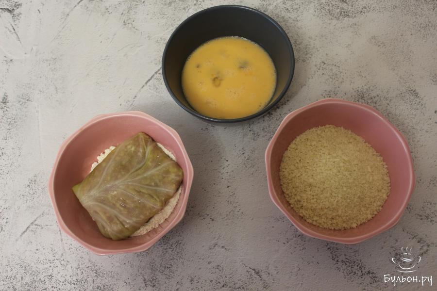 4. Каждый капустный конверт, сначала, обваляйте в муке. Затем окуните во взбитое яйцо, далее обваляйте в сухарях панко.